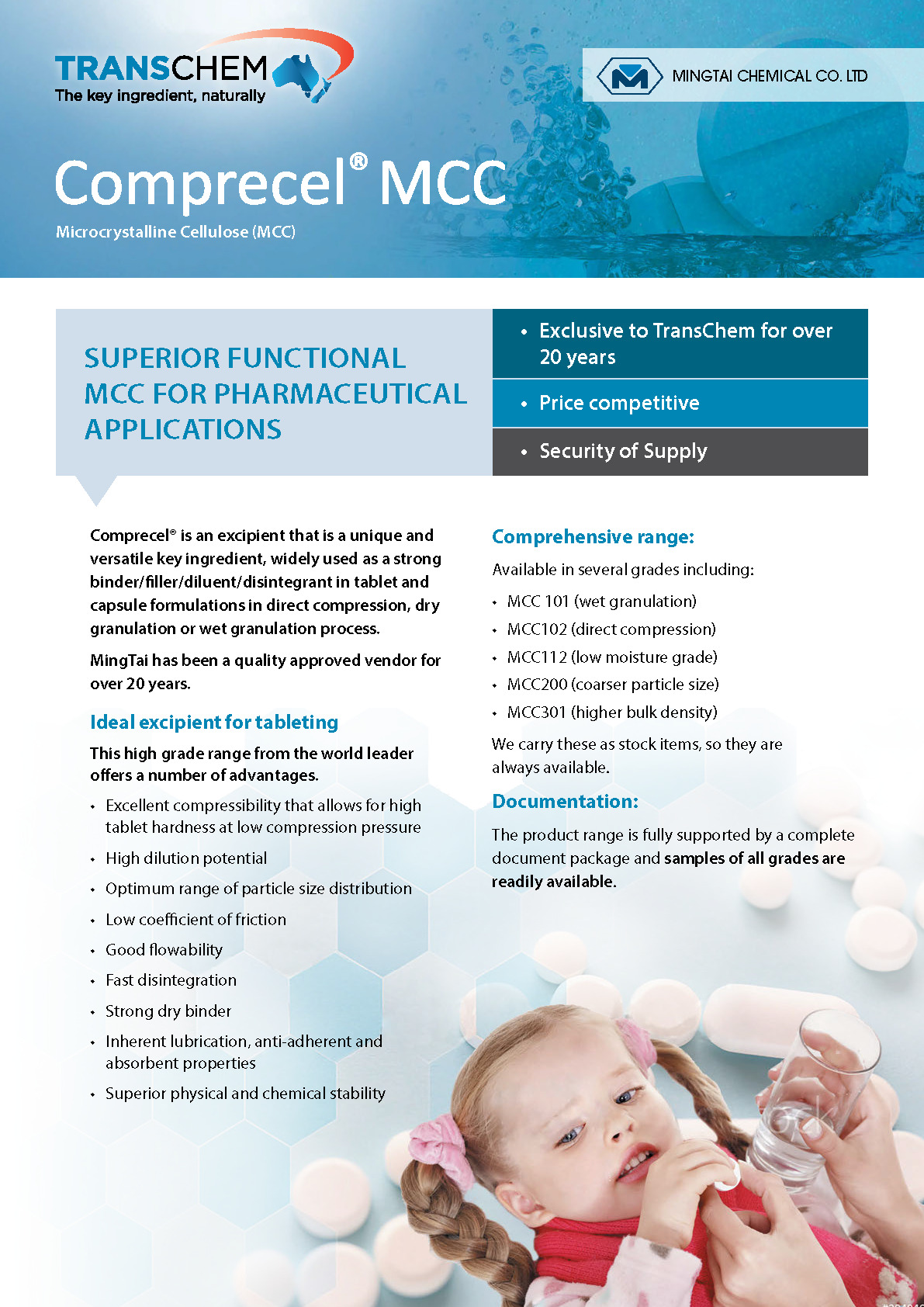 A common theme among many Pharmaceuticals is settling for a Microcrystalline Cellulose (MCC). Why? Comprecel® is the superior functional, competitively priced option that is exclusive to TransChem from a world-leading vendor who has been delivering consistently for over 20 years.