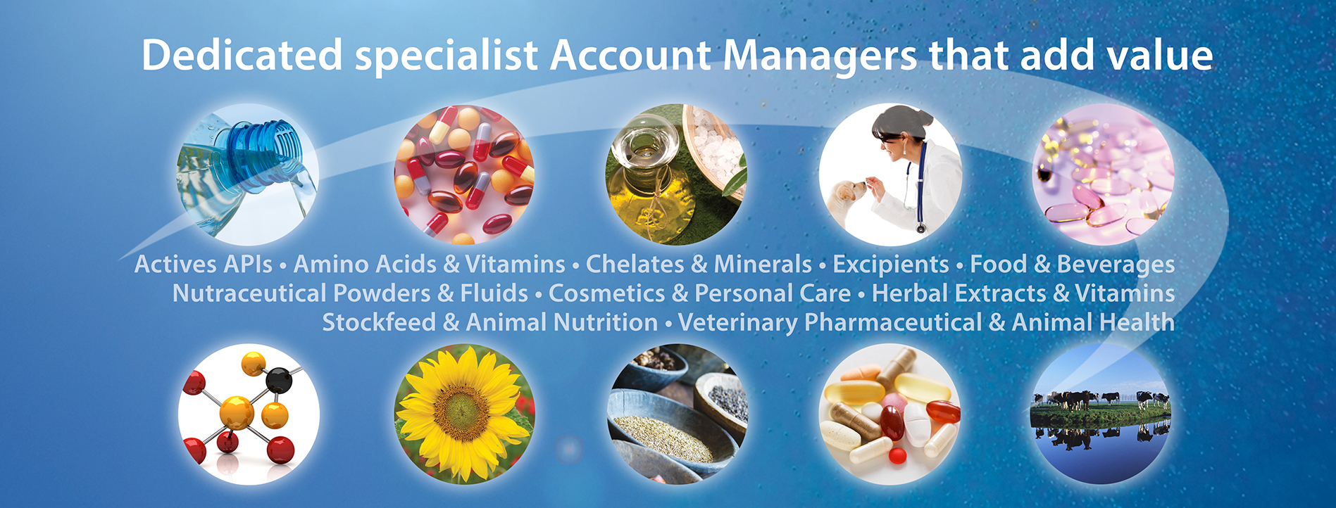 Primary and complementary quality ingredients for; Pharmaceutical, Veterinary Pharma & Animal Health, Nutraceutical, and Food & Beverage.